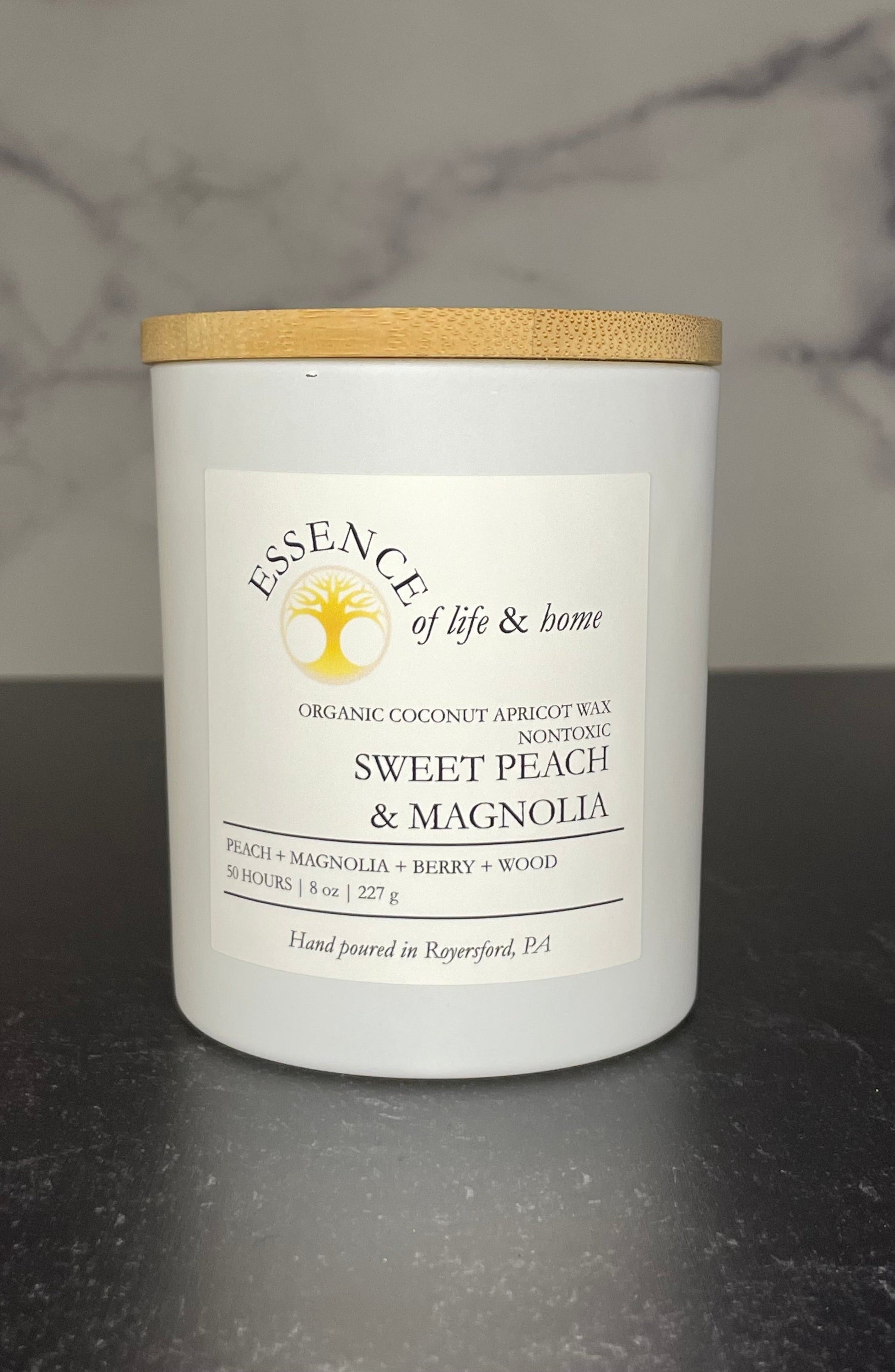 Sweet Peach & Magnolia captures the essence of a warm spring afternoon, where the sweet scent of ripe peaches blends with the soft, floral breeze of magnolia trees in bloom. It’s like sitting on the porch with a glass of peach tea, the sun on your skin, and the air filled with the fresh aroma of spring flowers. A touch of soft wood adds a cozy warmth, making this luxury organic candle a simple, beautiful way to bring that feeling into your home.